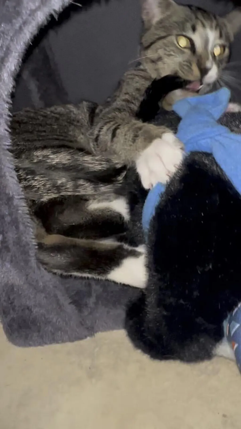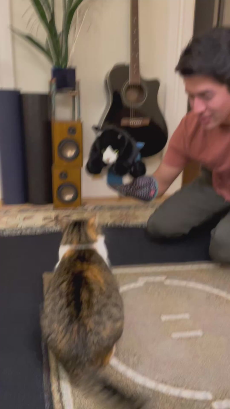 - Fingers in the paws and mouth— full puppet control, all four limbs and mouth move, more interactive. Less protection in the paw area if your cat bites hard.